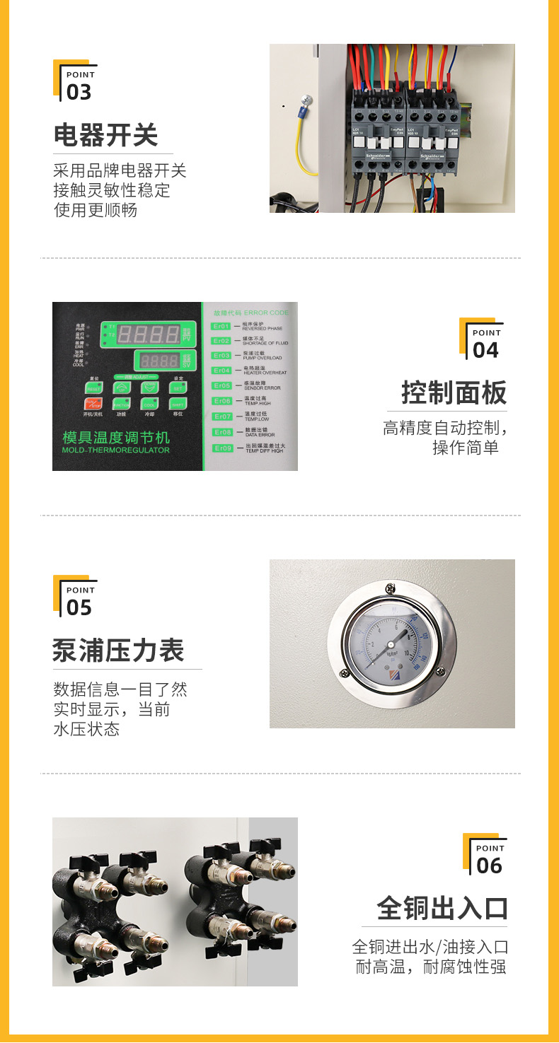 自動(dòng)模溫機(jī)的用途:塑料有熱脹冷縮的物理性質(zhì),因此若模具溫度不穩(wěn)定或控溫不準(zhǔn)確,會(huì)導(dǎo)*成型品夾水紋、縮水、歪曲、變形及表面光澤不良等現(xiàn)象。自動(dòng)模溫機(jī),正是因解決此類難題而特別設(shè)計(jì)制造的。自動(dòng)模溫是利用熱交換原理,機(jī)內(nèi)的發(fā)熱器及冷卻器通過(guò)微電腦的設(shè)定和監(jiān)測(cè),可準(zhǔn)確地調(diào)節(jié)水或熱媒油的溫度,并快速循環(huán)于模具加熱升溫或降溫,使模具在成型的時(shí)間內(nèi)得以保持穩(wěn)定的適當(dāng)溫度,確保成型的高品質(zhì),提高生產(chǎn)效率及節(jié)省電費(fèi)。
